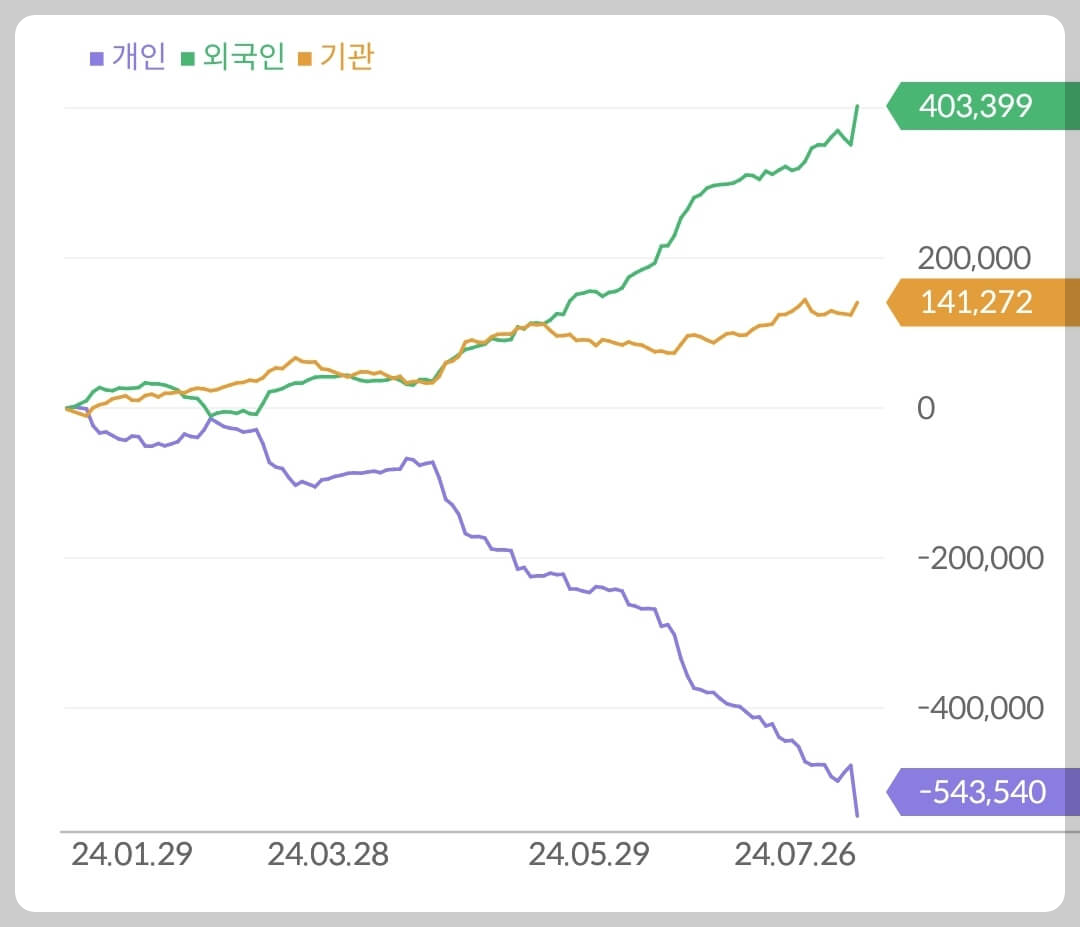 이전 카카오, JYP도 외국인들이 장기간에 걸쳐 매집을 했고 주가를 공격적으로 끌어올리며 개인 투자자들의 차익실현 물량을 다 받아냈지만 결국 고점에서 하락기에 진입했을 때 물량을 받은건 개인 투자자들이라는걸 기억해두시면 대응하시는데 도움이 되실 것으로 생각합니다.