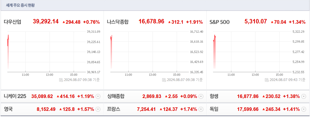 불확실성을 가장 싫어하는 시장은 일본의 위와 같은 발언에 환호할 수 밖에 없었고 급등하던 엔화가치는 하락하며 진정하기 시작했습니다. 당연히 전 세계 증시는 강한 반등이 진행중입니다.