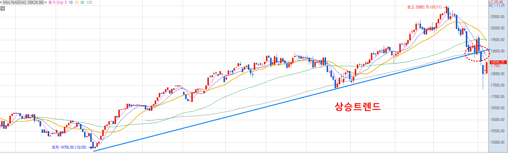 나스닥 상승트렌드가 깨졌다는 경고는 이미 지난주 금요일에 분석글을 통해 경고드렸었죠. 지금 반등이 상승추세로 전환하기 위해서는 결국 나스닥 선물지수가 최소 19,200위로 올라와서 상승 트렌드와 이평선 위에 안착해야 합니다. 그 전까지는 메이져들이 어떠한 이유를 갖다 붙이든 증시 조정을 이끌어낼 수 있습니다.