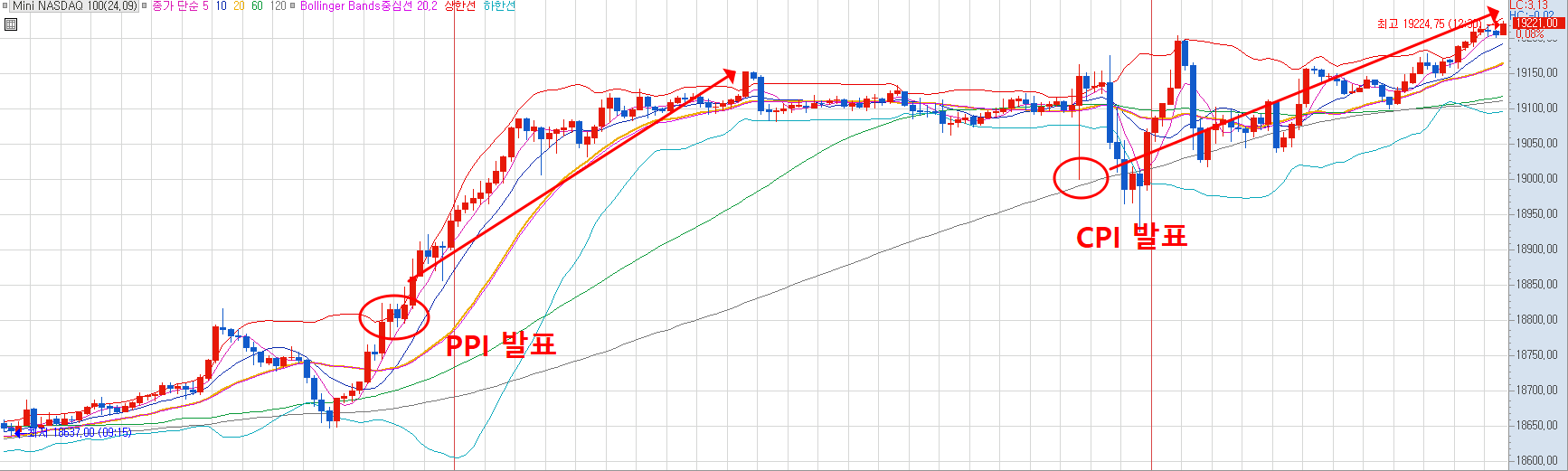 PPI 발표 이후 시장은 안도하며 조정없이 강한 상승을 이어갔지만 CPI는 조금 달랐습니다. 제가 말씀드렸다시피 CPI가 높으면 금리인하의 정당성이 떨어질 수 있고 CPI가 낮으면 경기침체 우려 재발로 해석될 수 있기 때문에 발표 직후에 해석이 엇갈리며 위아래로 변동성이 크게 발생한 모습을 볼 수 있습니다.