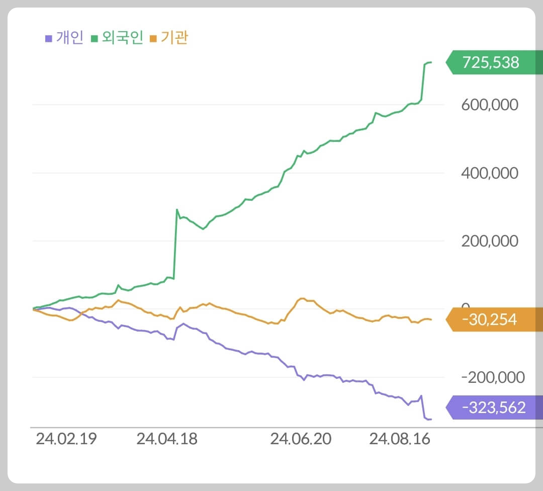 제가 추천했을 당시 크래프톤의 수급은 매우 좋았었죠. 당시 크래프톤의 외국인 지분율은 23%였는데 현재 30%를 넘긴 상황입니다. 이런 현상은 K-게임 섹터가 몰락하는 크래프톤의 독주가 외국인들의 한국 게임산업 포트폴리오를 선택과 집중할 수 있는 상황이 조성되었다고 판단됩니다.