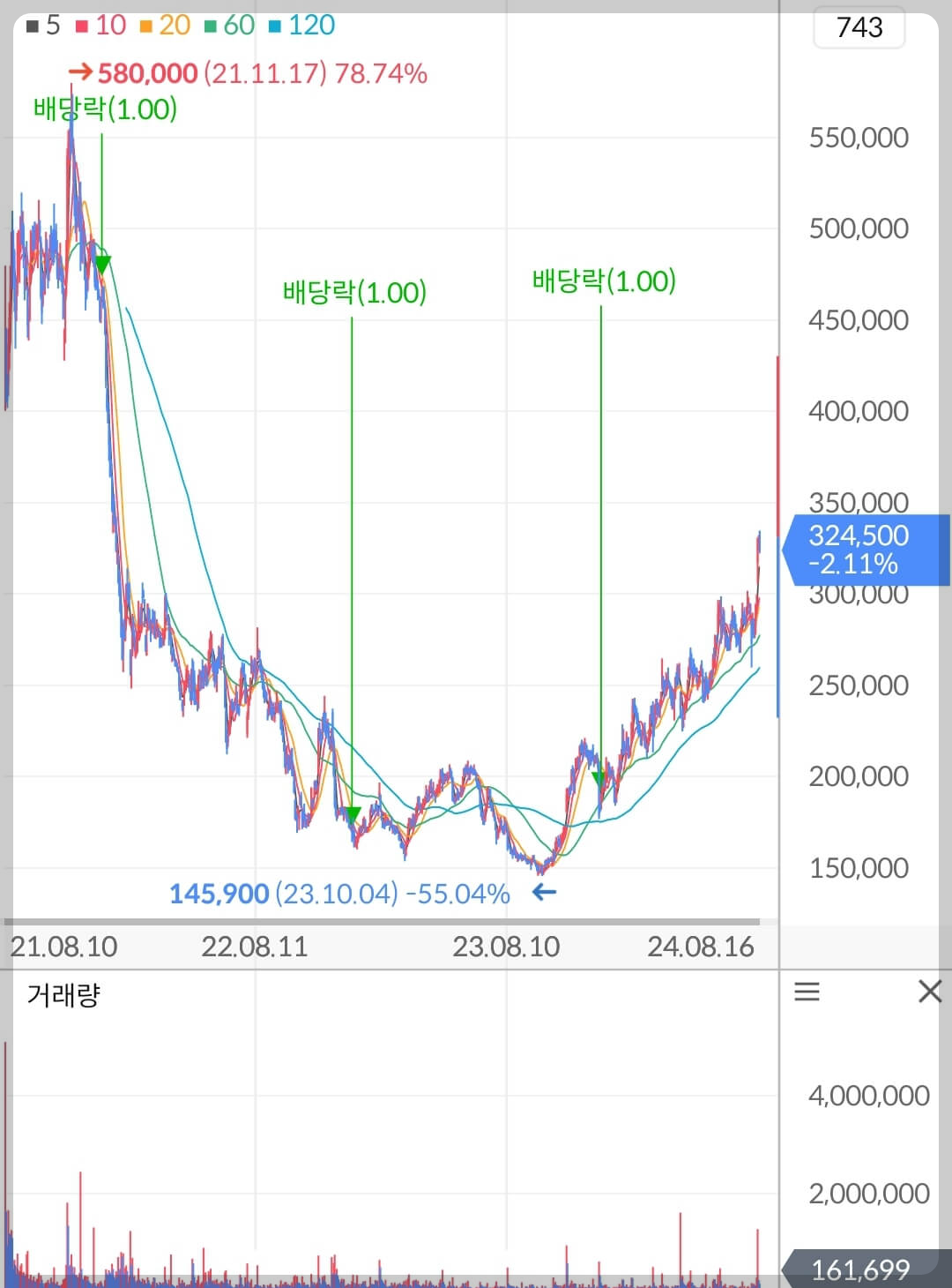 21년도 이후 코로나 시대를 벗어나면서 반발 작용으로 온라인 트래픽이 심하게 추락할 때 크래프톤의 주가도 같이 추락했습니다. 이미 저에게 지겹게 들으셨겠지만 다시 한번 말씀드리면 하락하는 주식은 매수하는 것이 아닙니다. 시장이 바닥을 확인해주고 추세전환 할 때 매수하셔야 시간, 심리, 리스크 관리까지 모두 챙기실 수 있습니다. 따라서 당연히 크래프톤은 24년도 상반기 전까지는 절대 추천하지 않았던 것입니다.