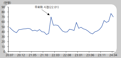 현재 리그오브레전드, 배틀그라운드 등 메가히트 출시작이 게임 시장에 진입한 이후 유저들의 관심을 확 돌려세울 경쟁작이 마땅히 없다는 것이 여전히 기존 대작들의 실적에 힘을 실어주고 있습니다. 위 배틀크라운드의 동시접속자 수 트렌드를 보면 23년 하반기 이후 크게 반등하는 것을 확인하실 수 있습니다. 기존 배틀그라운드에서 이탈되었던 게임 유저들의 타임을 킬링할 마땅한 게임이 없자 다시 기존 즐겼던 게임으로 회귀하는 것으로 해석할 수 있겠죠.