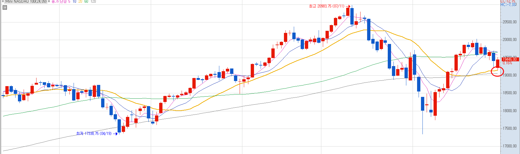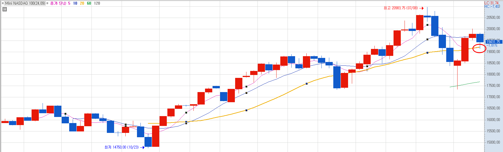 나스닥 일봉과 주봉 지지선이 이렇게 한 자리에서 겹치는 건 굉장히 드문일인데, 겹치는 자리에서 강한 지지가 나온 상황입니다. 물론 고용과 소비 부문 지표 악화로 경기침체 우려가 재발되어 다시 하락이 나올 가능성이 없진 않겠지만 당장은 엔비디아 실적 불확실성의 하락 갭을 메꾸는데 성공했기에 지수는 상승쪽으로 진행될 확률이 조금 더 높다고 보입니다.
