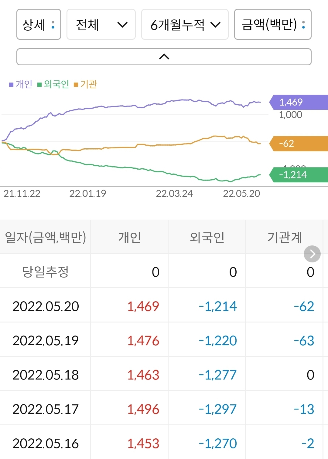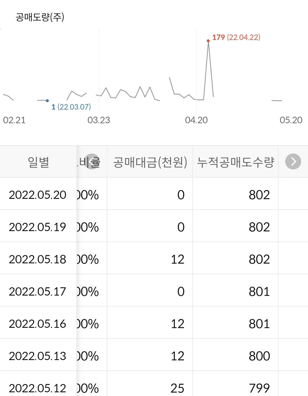 - 개인은 14억을 매수했고 외국인과 기관은 각각 -12억, -6천만 원을 매도했습니다. 기관은 해당 종목에 대한 관심이 전무해 보이며 외국인도 지분의 큰 변화는 없습니다.