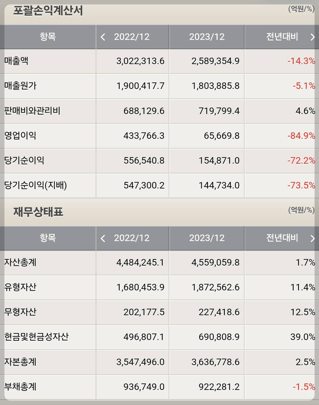 삼성전자는 위기입니다. 당장은 레거시 산업에서 발생되는 메모리 수요로 인해 숫자상 큰 타격은 없어보이지만 경쟁사들은 이미 미래를 위한 도약을 시작했고 상당 부문 성과를 거두는 수준까지 올라섰습니다. 언제까지 레거시 강자로 업계 1위를 지킬 수는 없습니다. 메모리, 파운드리 산업 모두 경쟁사들이 시대를 앞서가고 있기에 삼성전자는 후발주자임을 인정하고 굉장힌 위기의식과 남다른 노력이 필요한 상황입니다. 삼성전자의 재무 부문 종합등급은 A등급으로 평가하겠습니다.