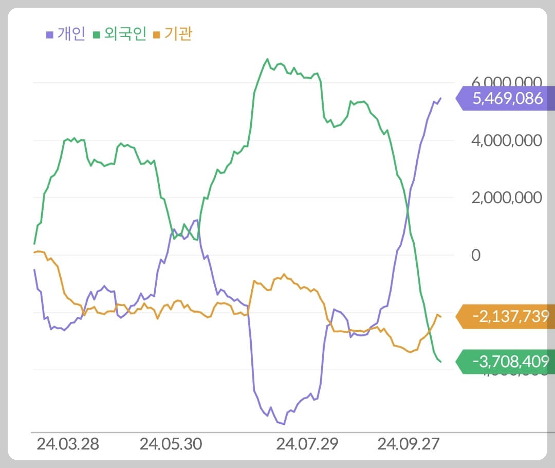 2021년 십만전자 간다고 대한민국이 들썩이던 당시 외국인 투자자들은 가장 먼저 조용히 삼성전자 주식을 내다 팔았습니다. 당시에도 단, 1년만에 약 40조원의 외국인 및 기관의 매도물량을 대한민국 개인 투자자들이 모두 받아냈죠. 다행히 손절하지 않았다면 최근 상승파동에서 본전 이상으로 대부분 탈출하셨을 거라고 생각하지만 오랜기간 자금이 묶이는 기회비용과 심리적 타격을 생각하면 큰 손실을 본 것과 다름이 없죠.