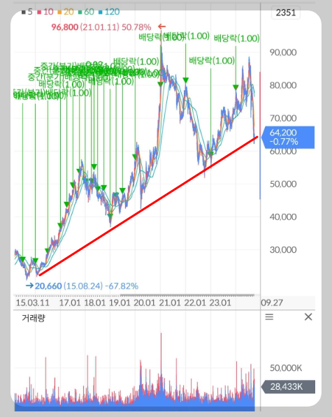 그래서 여러분들께 84,000원 이후 삼성전자의 목표주가를 제시할 수 없었던 겁니다. 여기서 필라델피아 반도체 지수까지 약세로 전환된다면 삼성전자의 주가는 조금 힘든 흐름이 이어질 가능성이 있습니다. 필라델피아 지수는 반등했음에도 삼성전자 주가가 무너졌다는건 글로벌 지수보다 삼성전자의 주가 모멘텀이 훨씬 약하다는걸 의미합니다. 현재 삼성전자의 주가는 15년도부터 형성해온 상승트렌드에 걸려있긴 한데 2021년 고점을 갱신하지 못한 헤드 앤 숄더 패턴이 될 가능성도 있기에 신뢰도는 그렇게 높아 보이지는 않습니다.