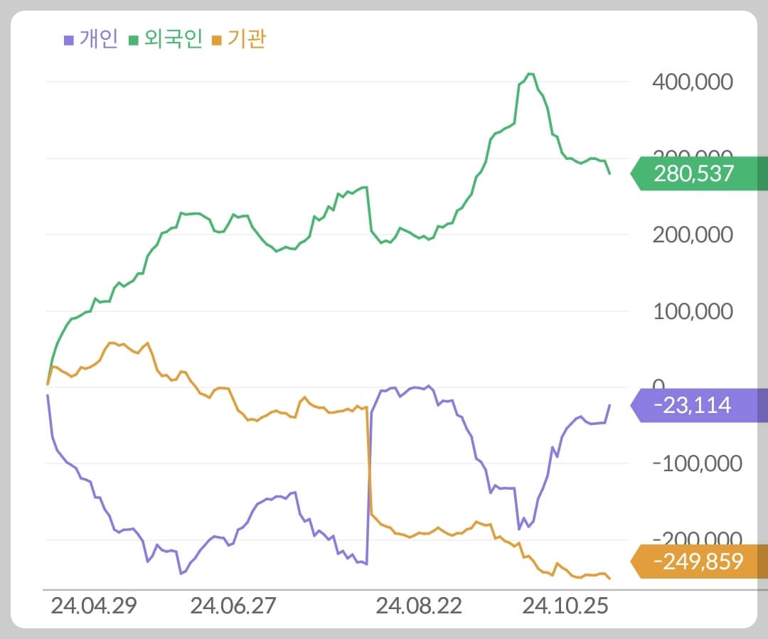 매물대 돌파를 주도한건 기관투자자들의 공격적인 매수 수급이었습니다. 그런데 공격적으로 유입되었던 기관 투자자들의 물량은 유입되었던 물량 그 이상으로 빠져나가며 아모레퍼시픽의 상승을 단기로 마감시켰습니다. 최근에는 외국인 투자자들의 매수수급도 살짝 꺾이며 오히려 역추세가 진행되고 있죠. 따라서 아모레퍼시픽의 수급 부문 종합등급은 D등급으로 평가하겠습니다.
