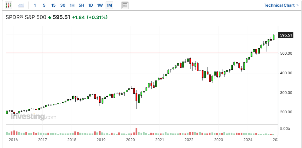 SPY : 애플, 엔비디아 등 기술주를 포함해 월마트, 제이피모간 등 우량한 기업들을 모아놓은 S&P500을 추종하는 ETF입니다. 최근 기술주들의 시가총액이 빠르게 증가하면서 S&P500에서 기술주들의 비중이 꽤 높아진 상황이긴 하지만 다양한 섹터의 기업들이 모여있는만큼 변동성은 작고 안정성은 높은 지수입니다. 축구 포메이션으로 비유하자면 미드필더쯤 되겠네요. S&P500은 20년간 약 600% 상승했습니다.