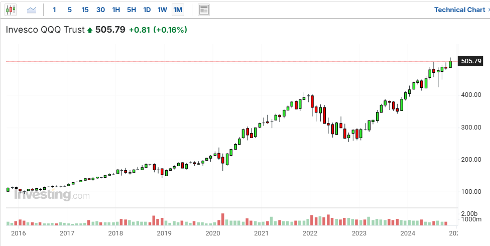 QQQ : 애플, 엔비디아, 마이크로소프트 등 세계 최고의 하이 테크놀로지 기업들이 모여있는 나스닥 지수에 투자하는 ETF입니다. QQQ에 투자하는 것만으로도 여러분들은 자동적으로 시대를 리드하는 세계 최고의 기업에 분산투자하게 되는 겁니다. 여러분들이 ETF 포트폴리오에 QQQ가 없다면 공격수 없이 수비수와 미드필더만으로 축구를 하는 것과 다를게 없습니다. 나스닥은 20년간 약 1,200% 상승했습니다.