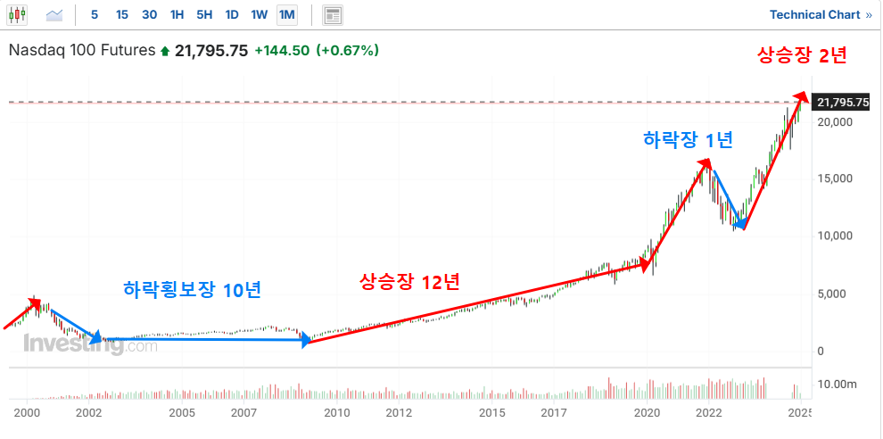 닷컴버블 이후 미국은 고통스러운 10년의 시간을 보냈고 12년 동안 폭발적인 상승을 기록했습니다. 그리고 다시 1년간 고점 대비 30%의 조정을 받은 뒤 다시 2년간 폭발적인 상승이 진행되고 있습니다. 2022년 당시처럼 강한 조정이 나와도 전혀 이상하지 않은 지점이긴 합니다만 계속 갈지, 횡보하다 갈지, 조정을 받고 갈지, 폭락하고 갈지는 전 세계 누구도 정확하게 알 수 없습니다.