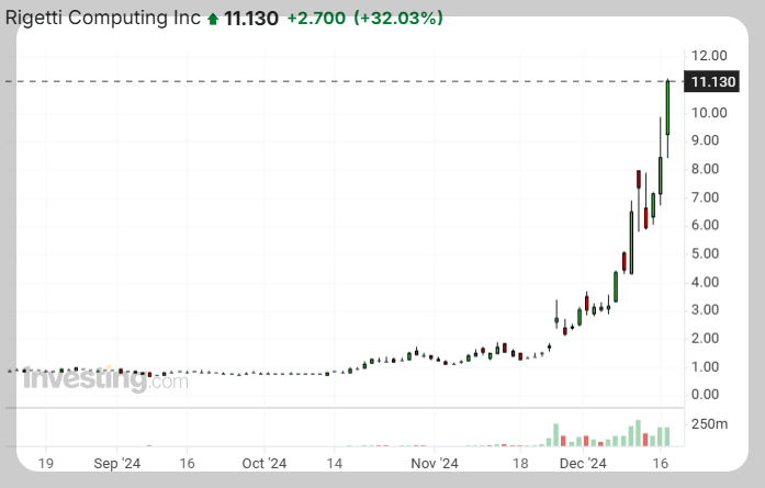 최근 대장주 자리를 노리고 있는 리게티컴퓨팅 주가 입니다. 이미 텐 배거 이상의 주가 상승을 기록했죠. 아이온큐와 다르게 초전도 양자컴퓨터 개발을 진행하고 있습니다.