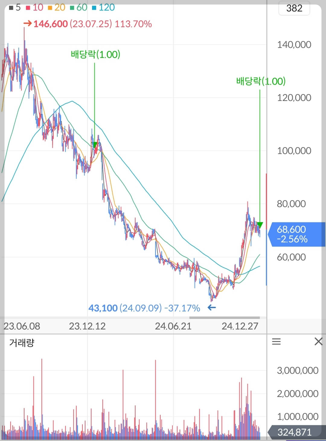 첫 번째 지지선인 6만원선까지 모아간다고 생각하고 이평선을 따라 주가가 재차 상승하는지 여부를 확인해야 합니다. 만약 상승한다면 저항대마다 익절하며 추세를 추종할 것이며, 만약 이평선 이하로 주가가 하락해 저항을 받으며 우하향 한다면 리스크 관리가 필요할 것입니다.