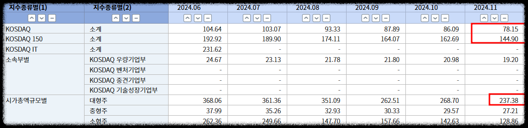그런데 코스닥을 보면 완전히 얘기가 달라집니다. 코스닥의 PE Ratio는 무려 78배로 엄청난 고평가 상태이고 심지어 코스닥 시가총액 상위 150으로 우량주로만 분류하면 PE Ratio는 무려 144배에 달합니다. 대형주로 분류할 경우 237배라는 말도 안되는 수치가 나옵니다. 코스닥 상장사 전체가 2024년 벌어들인 돈이 10조가 안되니 당연한 결과겠죠.