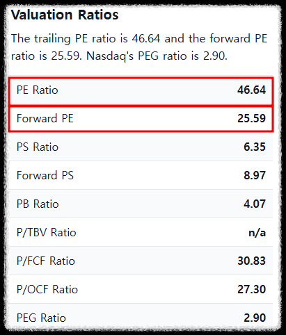 현재 나스닥의 PE Ratio 는 46.64로 높은편입니다만 나스닥에 속해있는 기업들의 이익이 크게 성장될 것으로 예상되기에 미래를 반영한 Forward PE는 25.59로 크게 낮아집니다.