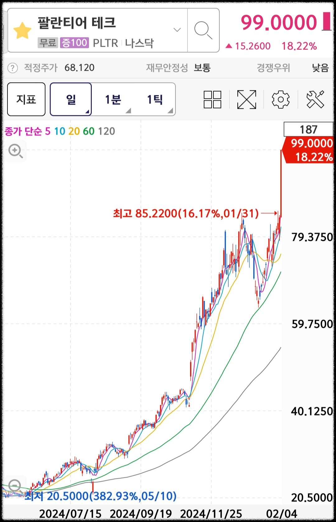 팔란티어 주가는 현재 프리장에서 18% 폭등하며 100$ 돌파를 눈 앞에 두고 있습니다. 60$에 추천드렸었던 팔란티어의 수익률은 벌써 60%를 훌쩍 넘어섰습니다.