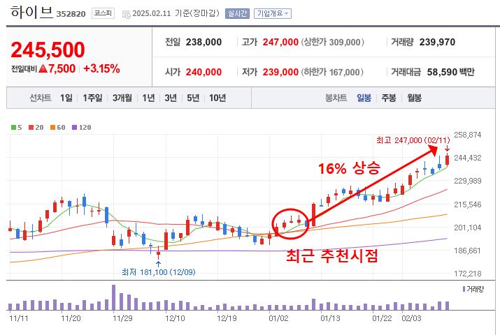 하이브는 20만원 밑에서는 고민하지말고 그냥 모아가면 된다고 말씀드렸던 종목입니다. 가장 최근 추천한 날짜는 1월 10일이었고 당시 주가는 21만원 목표주가는 26만원으로 공유드렸었네요. 당시 추천의 근거가 무엇인지 기억하시는 분들 계실까요?
