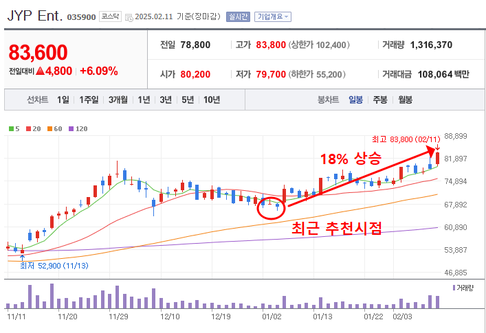 JYP는 제가 절대 매수금지로 지정해드렸던 종목입니다. 그리고 실제 주가는 146,600원에서 50,000원대까지 추락했죠. 그런데 제가 작년 12월 27일에 매수금지령을 해제한다는 글과 함께 매수추천을 드렸었습니다. 자세한 내용은 찾아보시면 지금도 확인하실 수 있습니다. JYP의 당시 주가는 68,600원이었습니다. 등급은 BBA등급을 부여했었고 목표주가는 90,000원을 제시해드렸었죠. 지금 주가는 어떻게 되었을까요?