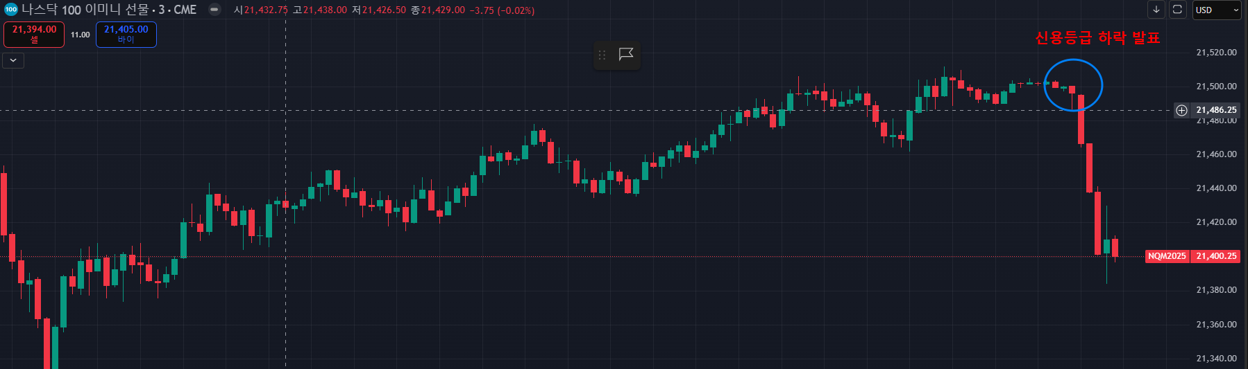 한국시간 5월 17일 3대 신용평가사 중 하나인 무디스가 미국 신용등급을 하향 조정했습니다. 미국 주식시장은 마감했고 선물시장은 종료 15분인 시점에 위 사항이 발표가 되었고, 발표 직후 애프터장과 선물시장에서 주가가 크게 하락했습니다. 그래서 오늘은 미국 국가 신용등급 하락이 어떤 의미를 가지는지 향후 증시 전망은 어떠한지 분석해 드리겠습니다.
