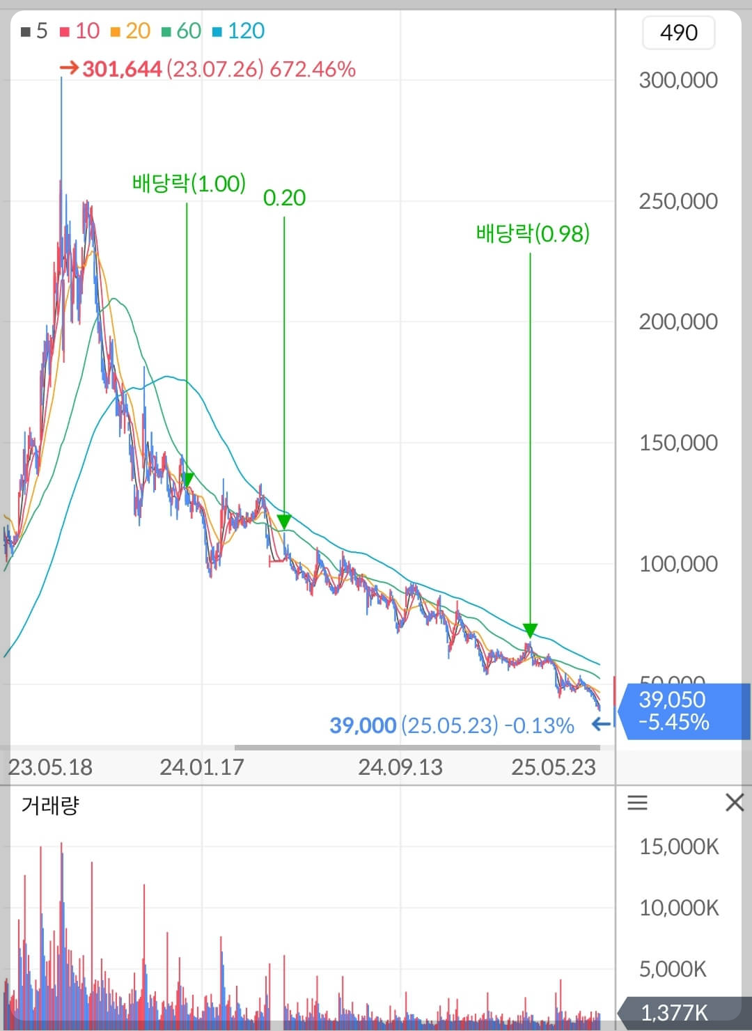 2023년 하반기 역배열로 전환된 이후 단 한번도 정배열로 전환된적 없이 원웨이로 하락추세를 보여주고 있는 아주 정직한 종목입니다. 따라서 매수가 아니라 오히려 개인 투자자들도 공매도 할 수 있다면 무조건 공매도를 해서 추세를 추종하는 매매를 하는게 맞는겁니다.