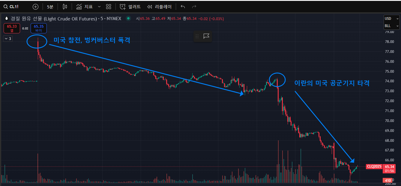 이스라엘-이란 전쟁 양상은 오일 선물 가격만 확인하면 바로 확인하실 수 있다고 여러번 말씀드렸습니다. 그런데 나스닥 선물 지수처럼 리스크를 크게 증가시킬 수 있는 사건이 발생했음에도 불구하고 시장은 전쟁종식이 머지 않았다는 걸 알고 있다는 듯 오일 선물 가격을 짓눌렀습니다.