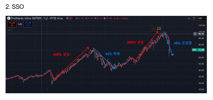 SSO는 71$이었네요. 지금은 얼마일까요? 97.5$입니다. S&P500임에도 2개월 수익률이 무려 37%가 넘네요.