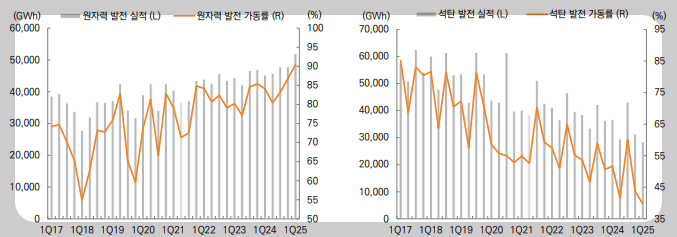 그리고 최근 시장 관심이 높아지고 있는 원전과의 관계성에 대해서 설명드리자면 원전 가동률이 높아지면 한국전력 수익이 높아진다는 겁니다. 제가 여러번 설명드려서 대부분의 구독자분들은 알고 계시겠지만 대한민국의 기저발전은 원자력과 석탄발전으로 구성되어 있습니다. 그런데 석탄화력발전소는 문재인 대통령의 저탄소 정책으로 점진적 폐지가 확정되어 이용율이 빠르게 하락하고 있고 결국 역사의 뒤안길로 사라질 예정입니다.