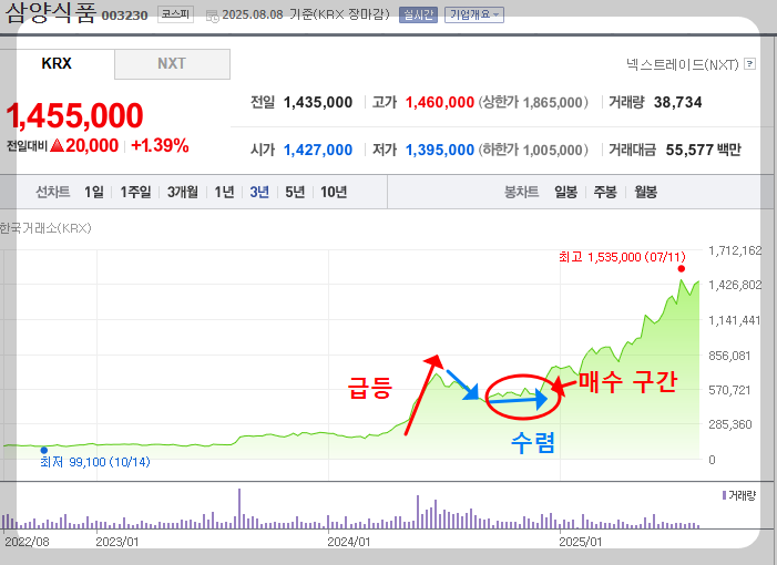 다만, 현재 에이피알의 주가는 이평선과 이격이 크게 벌어진 상황이기에 추격 매수보다는 이후 수렴하며 이평선과 이격을 좁히는 구간에서 매수하는 것이 좋은 전략이라고 판단됩니다. 이해하시기 쉽게 삼양식품 주가 패턴을 보여드리겠습니다.